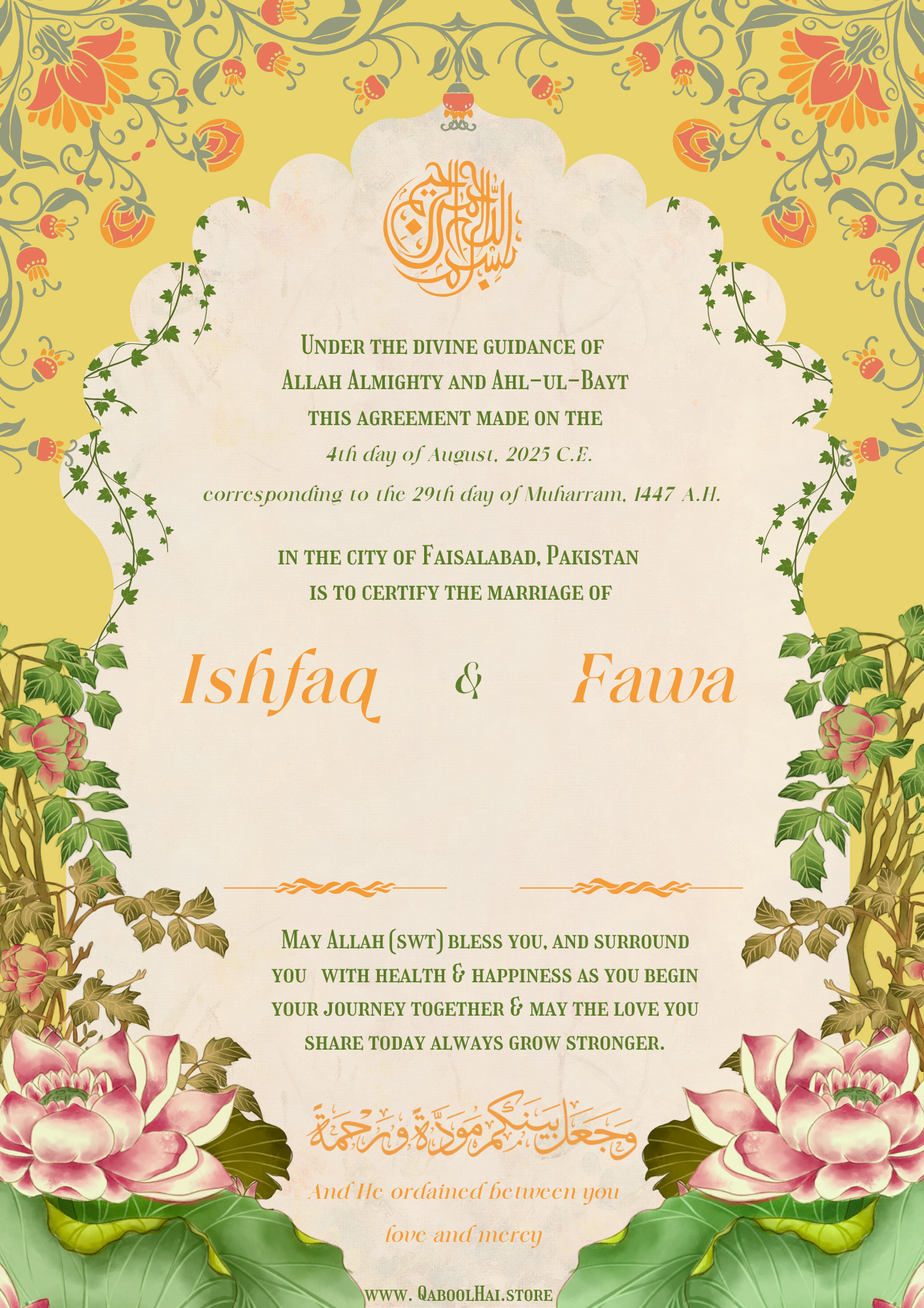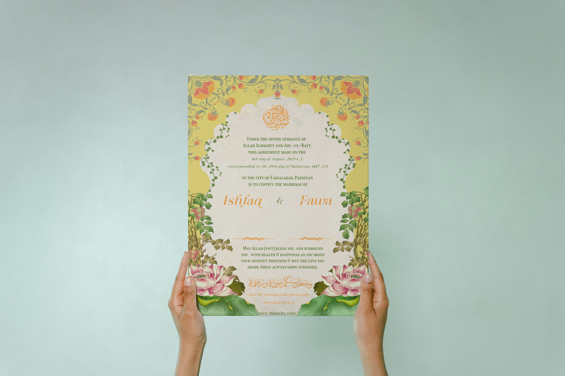 "Ghulistan 1" Nikkah Namah. Just like the name suggests, this design is a blooming garden of love, with delicate and detailed floral patterns that feel timeless and luxurious. The beautiful gold touches woven throughout the design make it feel truly special, perfect for a brand-new beginning.