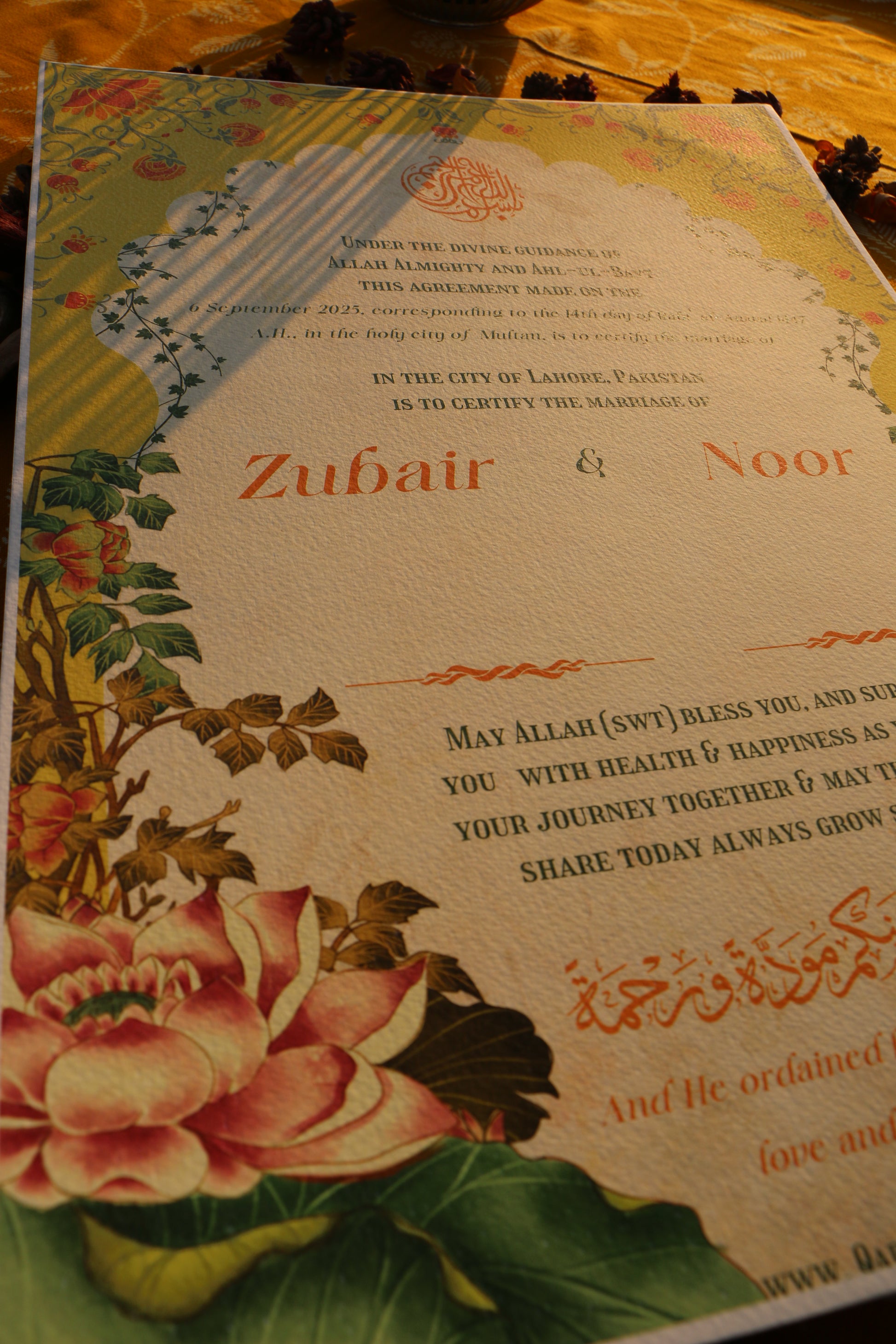 "Ghulistan" Nikkah Namah. Just like the name suggests, this design is a blooming garden of love, with delicate and detailed floral patterns that feel timeless and luxurious. The beautiful gold touches woven throughout the design make it feel truly special, perfect for a brand-new beginning.