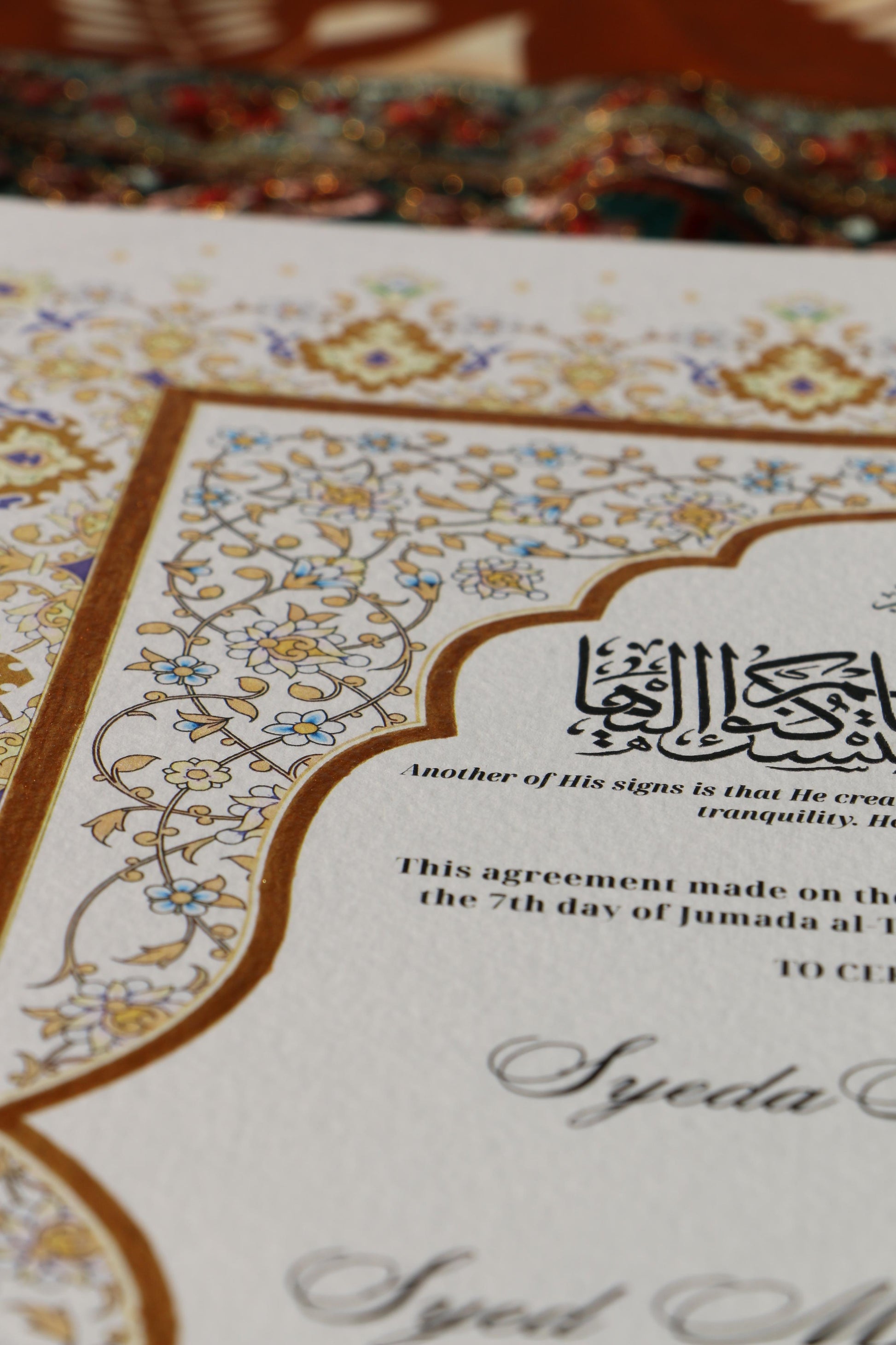 "Mahal-e-Dil" Nikah Namah. This design is a testament to timeless tradition, featuring a magnificent tapestry of intricate Mughal floral patterns that frame the agreement like the walls of a grand palace. The rich palette of gold, cream, and classic jewel tones gives the document a regal and formal character, making it a precious and dignified testament to the building of the Palace of the Heart.