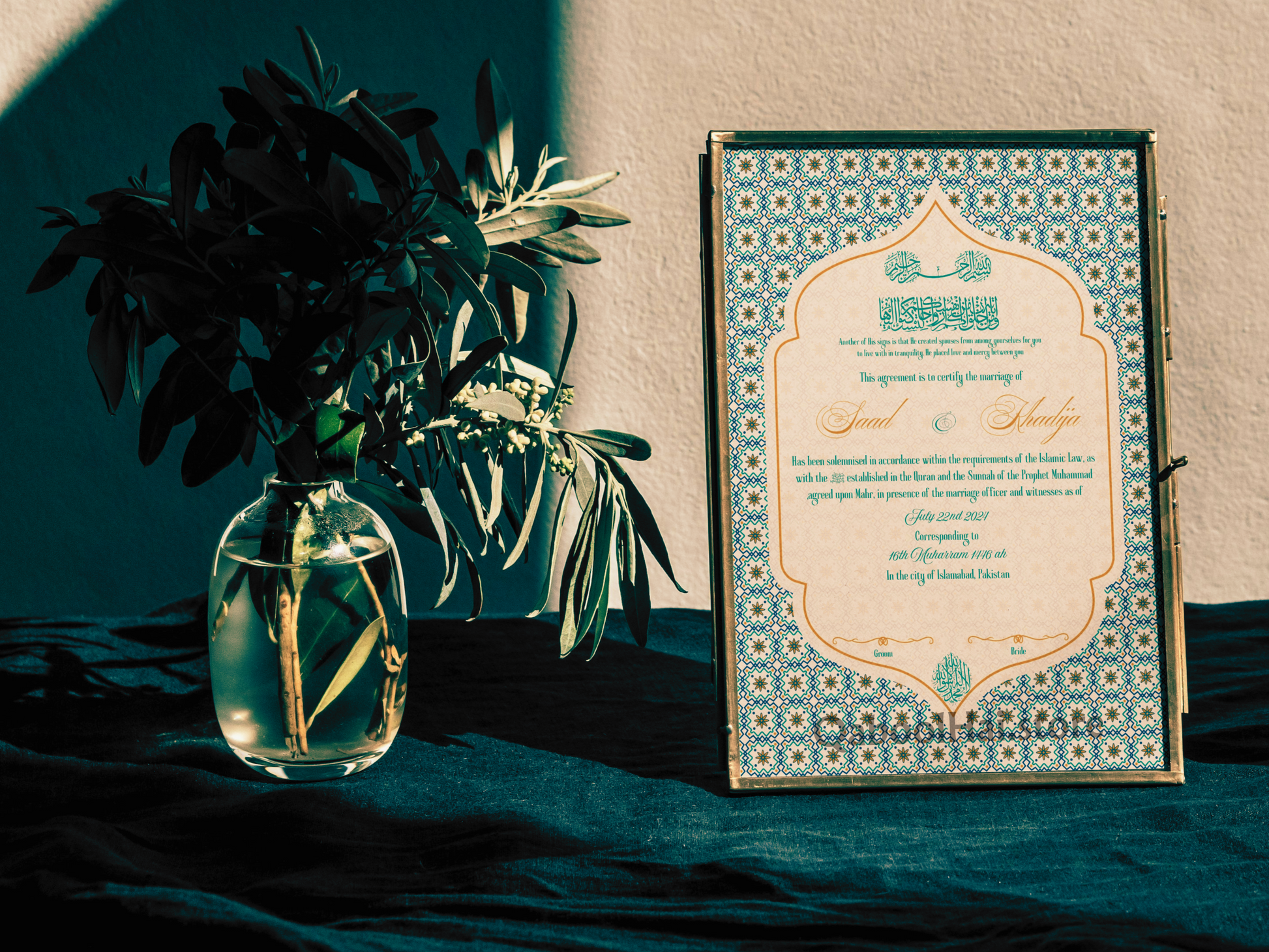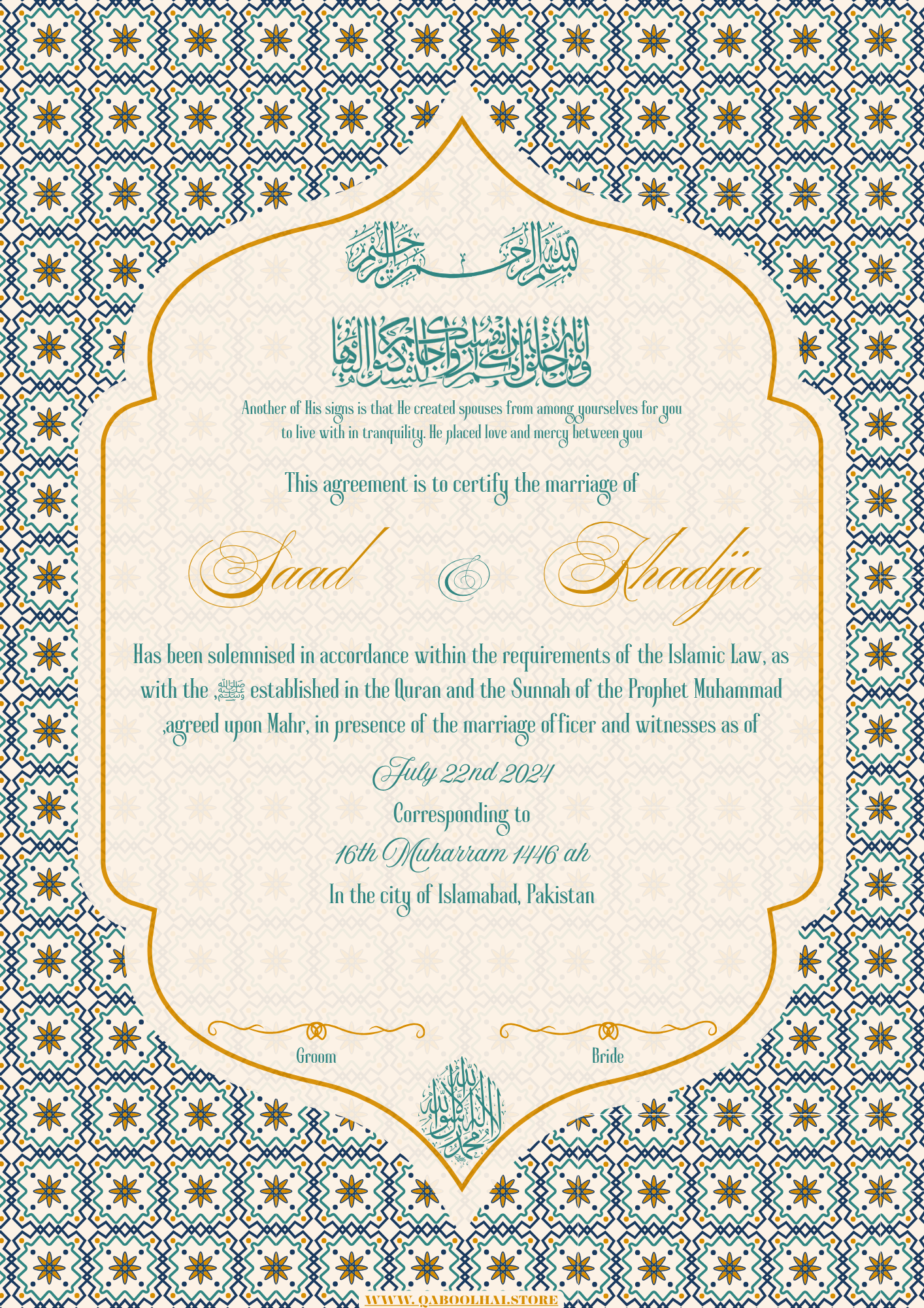 "Mehrab" is a Nikkah Namah design that draws inspiration from the timeless beauty of sacred architecture. Its intricate patterns, elegant arches, and central dome-like motif evoke the serene and spiritual grandeur of a mosque. This design is a tribute to tradition and faith, making it a profoundly meaningful and dignified choice for your special day.