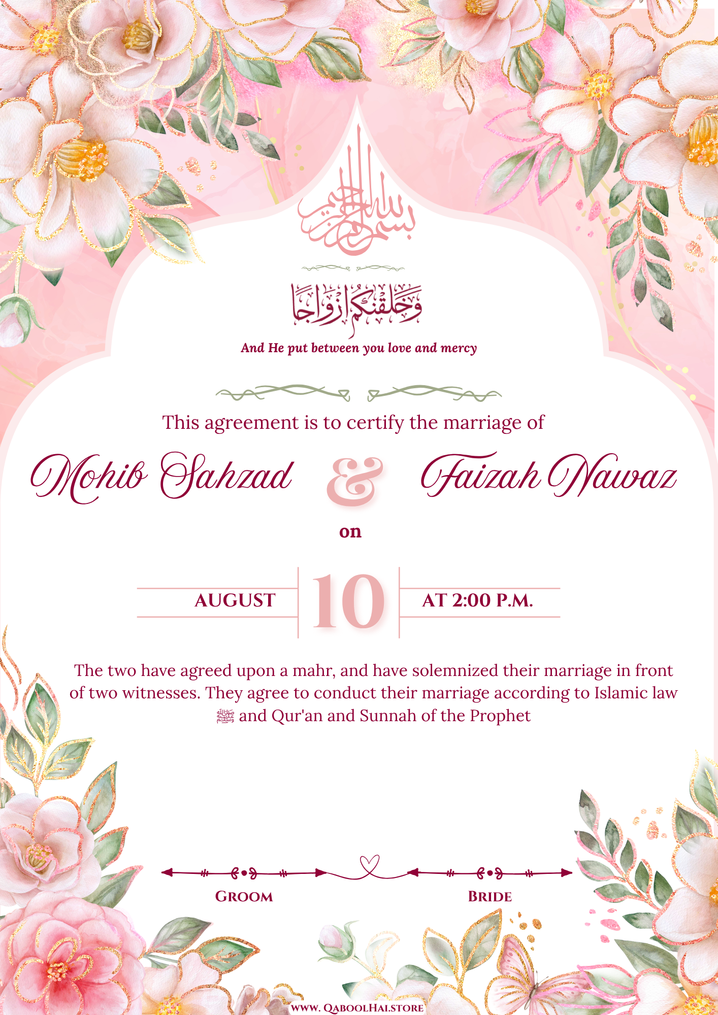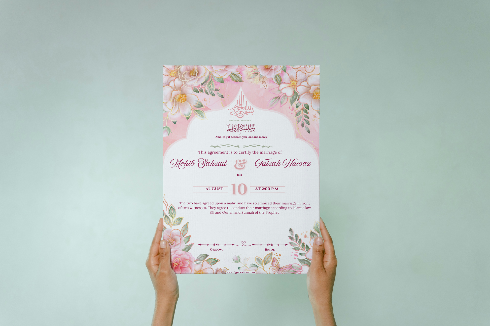 "Shahana" is a truly regal Nikkah Namah design, crafted for a couple seeking a touch of royal elegance. The intricate, geometric patterns are a celebration of traditional artistry, beautifully accentuated by a majestic color palette of deep red, gold, and emerald green. This design is a statement of sophisticated tradition, destined to make your special day feel truly magnificent.